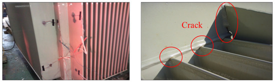 A structural strength test was conducted to verify the mechanical integrity of the 3 MVA transformer under a test condition of 0.75 bar for 2 cycles. As shown in Figure 1, failure occurred in the form of cracks in the welded joints between the panel and the fin. This failure is primarily attributed to stress concentration at the welded joint, exacerbated by pressure fluctuations and the thermal expansion and contraction of the transformer components during operation. These factors weaken the structural integrity of the welded area, making it susceptible to cracking under mechanical stress [12]. This highlights the importance of optimal design to address structural strength issues caused by such failures. The detailed specifications for the test transformer are summarized in Table 1.