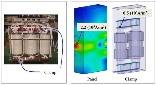 To calculate the power losses, 3D quasi-static electromagnetic analysis is used with the finite element method. The maximum eddy current density at panel and clamp are 2.2 and 0.5 × 105 A/m2, respectively, as shown in Figure 2.