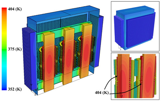 Winding and eddy current losses, as mentioned above, are inputted as heat sources for the heat transfer analysis. Other required models (radiation model, conduction model, turbulent model) are driven by computational fluid dynamics using the commercial CFD code Fluent. The ambient temperature is 300 K. Figure 3 shows the temperature contours of the panel, winding, and core. The hottest temperature of the winding is 404 K, in which the experimental value is 395 K, and the maximum temperature of the panel is 357 K [15].