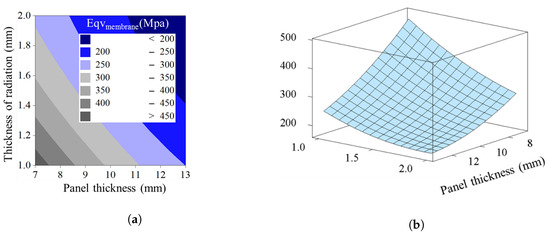 Results of maximum membrane stress analysis: (a) contour plot illustrating stress distribution as a function of and ; (b) response surface analysis showing the relationship between , and .