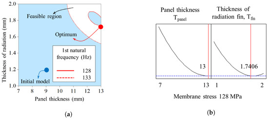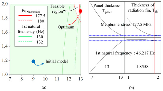 Figure 5 shows the feasible region of the optimal solution and the solutions determined by the optimizer. The optimal model demonstrates better performance than the initial model. Minimizing the thickness of the radiation fin reduces both the maximum generated membrane stress and the radiation characteristics of the fin. Figure 6 presents the membrane stress distribution between the initial model and the optimized model.