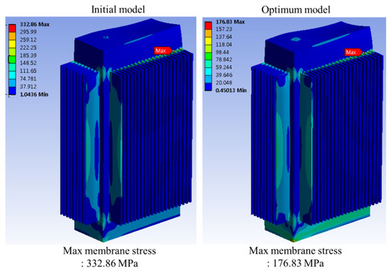 The membrane stress distribution between initial and optimum models.
