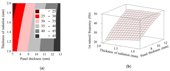 Figure 7 presents the contour plot and response surface of the first natural frequency. The results indicate that increasing the panel thickness while decreasing the radiation fin thickness leads to a significant increase in the first natural frequency. This outcome not only improves structural stiffness but also enhances the radiation characteristics of the fins.
