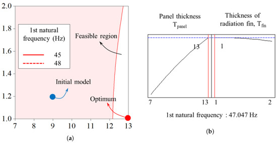 Feasible region of optimal solution: (a) overlaid contour plot showing the design space for maximizing the first natural frequency; (b) optimizer-determined solution.
