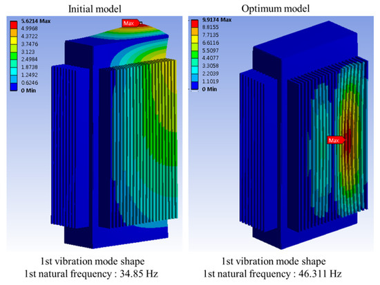 Figure 9 shows the first vibration mode shape for both the initial and optimized models. The differences in the mode shapes are primarily attributed to the variations in the panel and radiation fin thickness, reflecting the improvements in stiffness achieved through optimization.