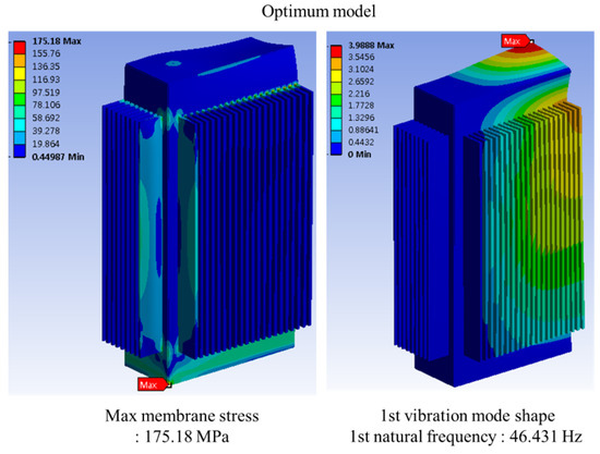 The structural strength analysis was conducted to verify the membrane stress of the developing transformer under an internal pressure of 0.75 bar and thermal load, as determined by the CFD results. Figure 4 shows the contour and response surface of the maximum membrane stress. The maximum membrane stress is reduced from 332.86 MPa in the initial model to 175.18 MPa in the optimized model, representing a 47% reduction. This improvement is primarily due to the optimized panel and radiation fin thickness, which redistribute the stress more effectively.