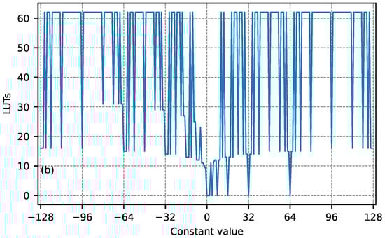 LUT utilization of bespoke multiplications on ZYNQ-7000 devices: is an 8-bit value, and is a constant value in .