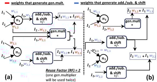 Example of bespoke multiplications of two neurons with two inputs when: (a) an RF = 2, and (b) weight sharing results in multiplication sharing.