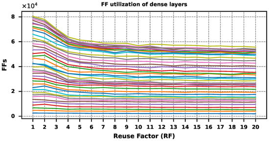 The relationship between the RF and the number of required FFs for layers of different sizes is presented in Figure 3. We generated 40 random dense layers at 300 MHz on the PYNQ-Z2 platform with 8-bit coefficients and a number of neurons and inputs in the [20, 512] range. Each layer was synthesized 20 times with RF values from 1 to 20. Every curve in Figure 3 represents one of the 40 layers. Layers with more coefficients utilize more FFs, but as the RF increases, the number of utilized FFs drops due to the decrease in the number of generic multipliers. However, for RF > 7, the number of FFs saturate, s as the registers used to pipeline the layer counterbalance the previous decrease.