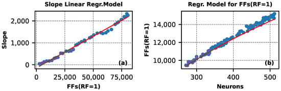 To obtain the slope estimates, we employed a dataset of 150 random layers with 8-bit coefficients, synthesized at a 300 MHz target clock frequency on the PYNQ-Z2 platform. We trained a linear regression model on 100 points and evaluated its accuracy on 50 points. The achieved value was 0.98. Therefore, a layer’s FFs number can be estimated by