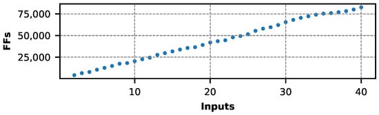 The number of inputs has a similar effect on the number of bespoke multipliers and hence registers. In this case, the relationship of and FFs is perfectly linear, as shown in Figure 5. Therefore, we estimated the number of a layer’s FFs when by
