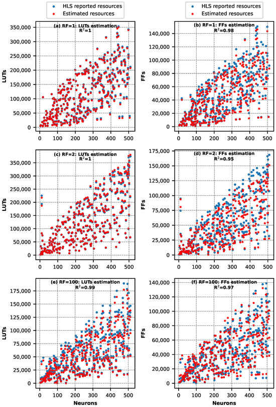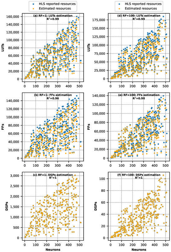 First, we evaluated the efficacy of our estimator in predicting the resources required by only one dense layer. For the considered architectures, we performed Monte-Carlo simulations with 400 randomly generated dense layers by hls4ml. Specifically, the number of neurons and layer’s inputs were uniformly sampled in the range [2, 512], while random 8-bit coefficients were generated for the neurons. Figure 6 presents the Monte-Carlo results when the generic multipliers were implemented in LUTs, and thus no DSPs were used. The average relative root-mean square error (RRMSE) for the LUT estimation was and for the FFs, in these examined architectures. In all cases, the was above 0.95. Hence, our estimator can relatively accurately predict the required FFs and LUTs. Similarly, scatter plots in Figure 7 present the same analysis when the generic multipliers were implemented in DSPs. In Figure 7, and 100 are shown. In this case, the number of utilized DSPs (Figure 7c,f) were precisely estimated (i.e., zero error) for all the layers and both architectures. Again, in Figure 7, the LUTs and FFs are relatively accurately predicted with being higher than 0.96. For , similar results to were obtained (i.e, , and for the LUTs’, FFs’, and DSPs’ estimation, respectively,) and thus are not presented in Figure 7 for readability reasons. The average RRMSE for this type of implementation when RF = 1, 2, 100 was for the LUT estimation and for the FF estimation, respectively.
