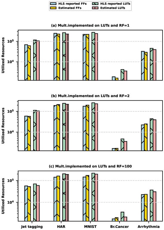 Comparison between our estimator and HLS for the LUTs’ and FFs’ utilization for the 5 MLPs. The generic multipliers are implemented in LUTs. Each figure shows the utilized resourced when (a) , (b) , and (c) . The Y-axis is in logarithmic scale.