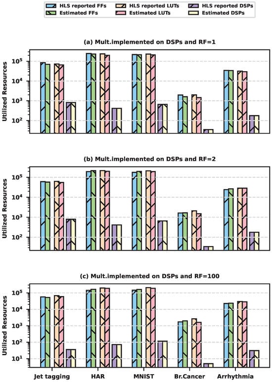Comparison between our estimator and HLS for the LUTs’, FFs’, and DSPs’ utilization for the five MLPs. The generic multipliers are implemented in DSPs. Each figure shows the utilized resourced when (a) , (b) , and (c) . The Y-axis is in logarithmic scale.