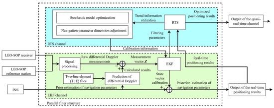 - A novel LEO-SOP/INS method is proposed that alleviates the problem of weak observability by using trend information extracted from batch data. The method is based on a two-channel parallel filter structure in combination with the extended Kalman filter (EKF) and the Rauch–Tung–Striebel (RTS) smoother. The structure combines the trend information extracted from the RTS batch-processing results to optimize the stochastic model of the real-time positioning channel and adjusts the dimension of the navigation parameters.