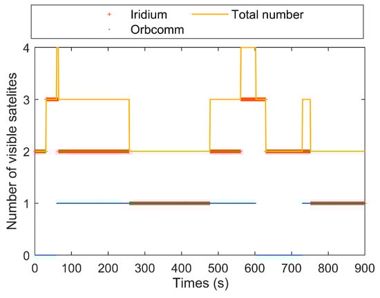 The simulation experiment considers the scenario where both the reference station and the receiver are equipped with high-precision atomic clocks. The clock difference between the reference station and the receiver was corrected in advance. The height direction of the positioning was constrained by a barometer. The parameters of the simulated INS in the simulation experiments are detailed in Table 1. A simulated LEO-SOP receiver was designed specifically to process signals from the Iridium and ORBCOMM constellations for Doppler estimation. For the Iridium constellation, the LEO-SOP receiver estimates the Doppler shifts by leveraging the single-carrier pilot signals embedded in the downlink burst frames transmitted by the Iridium satellites. For the ORBCOMM constellation, Doppler estimation is performed using the symmetrical differential phase-shift keying (SDPSK)-modulated signals within its downlink transmissions. The update interval of the inertial navigation system was 0.01 s, and the update interval for the Doppler results output by the LEO-SOP receiver was 0.1 s. The evolution of the number of visible satellites over time during the experiment is shown in Figure 2. It can be seen that the number of visible satellites never satisfied the instantaneous Doppler single-point positioning calculation during the test. The observability of the LEO-SOP/INS system was weak. During the simulation experiment, the non-holonomic constraint (NHC) assistance was added to the positioning calculation process of both methods to improve the positioning effect.