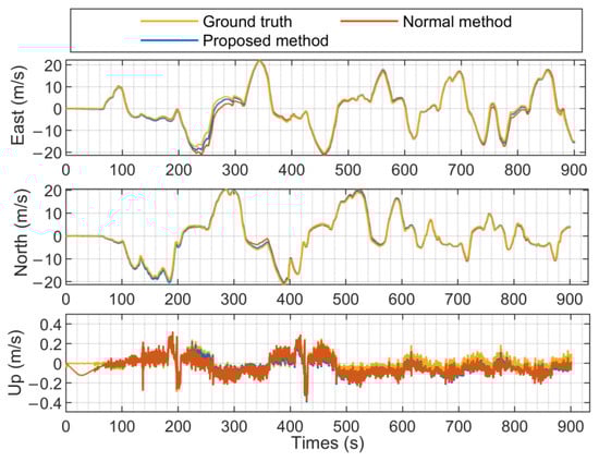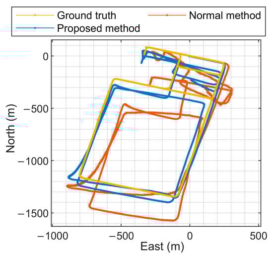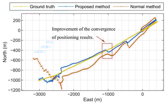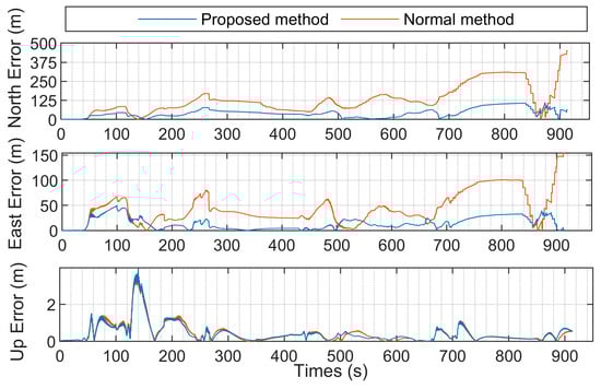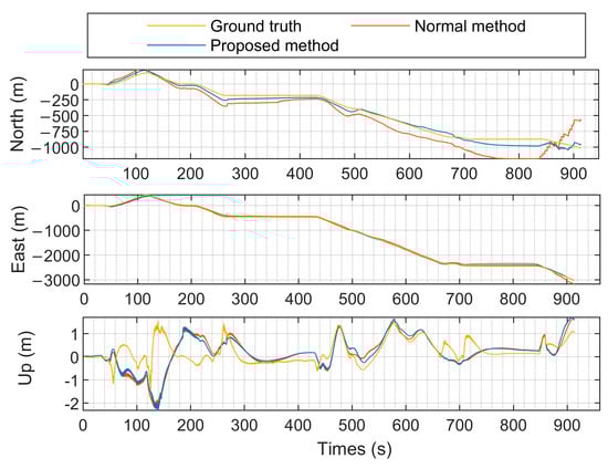 In the following, the positioning results of the proposed method and the normal method will be compared and analyzed in the local East-North-Up (ENU) coordinate system. Figure 3 compares the positioning results of the two methods in horizontal directions. The positioning results of the proposed method are significantly superior to the normal method. The positioning results of the proposed method are closer to the ground truth and can effectively reflect the vehicle movement trajectory. However, the positioning results of the normal method show a trend of gradual divergence, and its ability to maintain positioning is less effective than the proposed method.