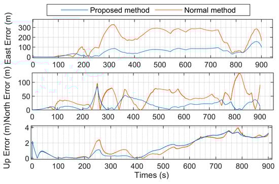 Figure 10 shows the variation in the positioning deviations in each direction over time for the two methods. The up-direction positioning errors of the two methods are well suppressed due to the assistance of the same barometer, and the error levels are similar. The errors in the east and north directions of the proposed method are generally more minor than those of the normal method. It is worth noting that there are times when the positioning errors of the proposed method are more significant than those of the normal method. This is because the sensitivity of the positioning effect of the proposed method is slightly affected, resulting in a slight increase in the positioning errors. However, as shown in Figure 10, the errors can be re-converged and suppressed quickly after the errors increase.