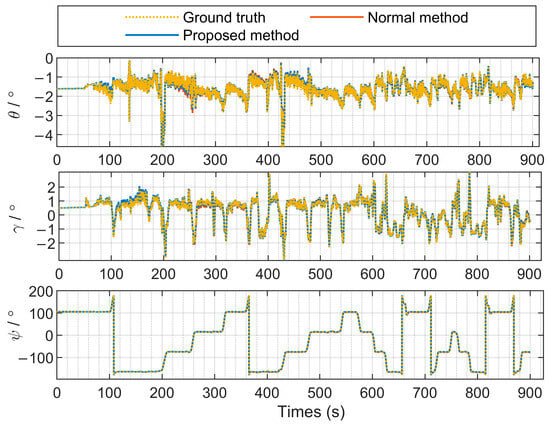 Figure 5 and Figure 6 show the velocity and attitude estimation results of each method over time, respectively. The velocity parameter estimation results of the proposed method are superior to the normal method in all directions. In combination with the analysis of the position results, the proposed method can effectively estimate the position vector and velocity vector of the receiver in dynamic scenes. As shown in Figure 6, the attitude estimation results of the proposed method are also superior to those of the normal method in all directions.