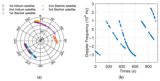 Visible satellites and Doppler measurement information during the on-board experiment: (a) Satellite distribution sky map during the experiment; (b) raw Doppler measurements during the experiment.