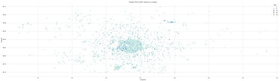 The first image (Figure 11) shows a map with numerous red dots, representing the locations of electromagnetic field (EMF) measurements scattered throughout the urban area in the center of Paris. The map provides a clear view of each data point’s location but does not convey the intensity or concentration of values between these points. Therefore, it is necessary to refer to the second image, which is an overlay of the electric field strength map on the same urban area. This map uses different colors (yellow, green, and purple) to represent the intensity or density of the variable throughout the region. Areas with warmer colors, such as yellow or red, indicate higher values, while areas with cooler colors, such as green or purple, indicate lower values. This heatmap was generated using the optimal model, k-nearest neighbors (k-NN) with and , as the interpolation method (Figure 12).