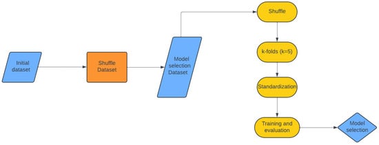 Before diving into model training, we took steps to ensure our data were clean and ready to use (Figure 2). First, we shuffled the initial dataset to prevent feature clustering and ensure a representative sampling of all possible conditions. For the model selection process, we utilized a combination of two methodologies to evaluate our machine learning algorithms: the shuffling method and 5-fold cross-validation. Initially, we randomized the order of entries within the model selection dataset, then split the data into training and validation pairs using a 70–30% split ratio. Next, we divided the training dataset into five subsets, applying the 5-fold cross-validation method. Standardization, as described in Figure 2, was performed for each split during the 5-fold cross-validation. This entire process was repeated 10 times. By integrating these methodologies, we generated 50 pairs of training and validation sets, enabling a robust evaluation of various interpolation methods. The shuffling method introduced variability and randomness into the selection process, while the 5-fold cross-validation ensured comprehensive coverage of the dataset in a systematic manner.
