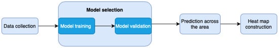 A heatmap generated by machine learning regression algorithms shows how a predicted value changes in a specific area. Different colors represent different levels of the value, with warmer colors indicating higher levels. The machine learning model is taught to predict this value based on other information, and the heatmap visualizes the model’s predictions for different points. To create a heatmap using machine learning regression, the process (see Figure 3) starts with data collection, which involves gathering data that include input features (the set of variables as described in Section 2.1) and the target variable (electric field strength) for various points. The next step is model training, where a regression model (such as linear regression, random forest, support vector regression, or neural networks) is trained using the collected data to learn the relationship between the input features and the target variable. Once the model is trained, it is applied to make predictions across a grid or spatial area, generating predicted values for a dense set of locations or feature combinations, even in places where original data were not available. These predicted values are then visualized on a heatmap, where different colors represent varying ranges of predicted values, such as red for high values and blue for low values, creating a gradient effect. Regression-based machine learning heatmaps show predictive values rather than actual measurements, which makes them useful for forecasting in unsampled areas.