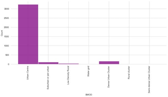 Figure 4 is the bar chart, which illustrates the frequencies of different categories of SMOD. The “Urban Centre” category dominates the chart with a significantly higher count compared to the other categories.