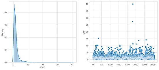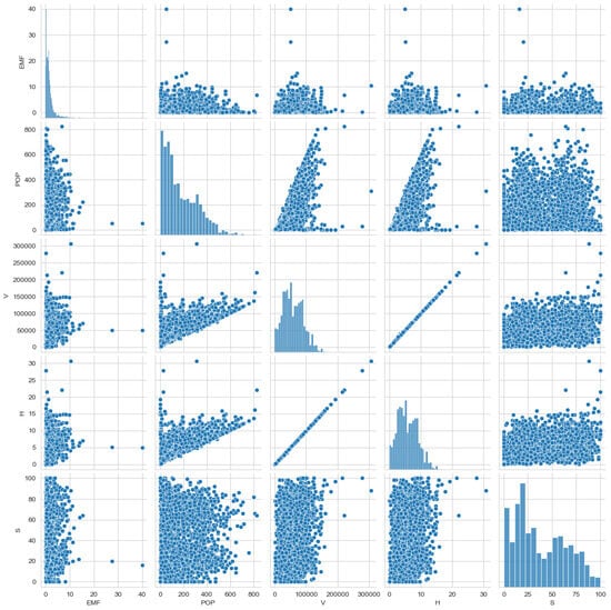 Figure 6 offers a comprehensive visualization of the relationships between different variables in our dataset. It combines both histogram and scatter plots, providing a unique overview of the distributions and correlations of the dataset. The diagonal of the pair plot shows the histograms for each variable, which provides information on their distributions. The electromagnetic field (EMF) strength distribution is heavily skewed toward lower values, while the population (POP) shows a more spread-out distribution. The variable V (volume) displays a distribution concentrated around lower values but with a significant spread, indicating variability in the built-up volume around the antennas. The height (H) and surface (S) also show varied distributions, with some concentrations at lower values and notable spreads. Figure 6 illustrates the pairwise relationships between variables. There seems to be a strong positive correlation between V and H, suggesting that higher building volume values are associated with higher building heights. There appears to be no significant correlation between EMF and the other variables. Also, the EMF and POP plots suggest that population density alone does not directly predict EMF levels.