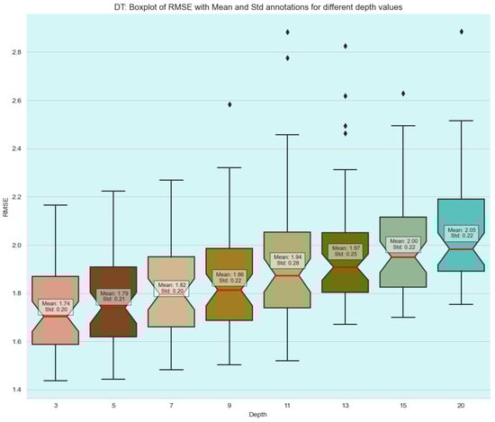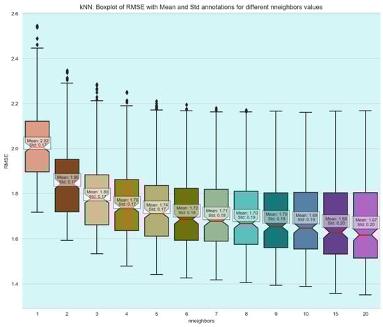 Further analysis of the RMSE distribution confirms that kNN exhibited the most stable performance. Even with a different configuration, such as , the algorithm managed an RMSE of 1.78 and a standard deviation of 0.21, which are still comparable to the best performance achieved by decision trees. This indicates that kNN is less sensitive to changes in hyperparameters than the other models, maintaining competitive accuracy under various settings.