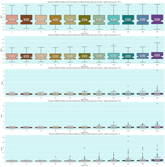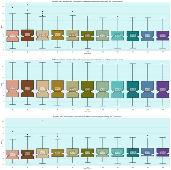 and is applied component-wise. Also, we refer to the matrices as the weighted matrices and to the vectors as the bias vectors. Additionally, we refer to and as activations and pre-activation functions of the neurons in the l-th layer. The width and the depth of the neural networks are defined as and L, respectively. In this study, we fine-tuned four hyperparameters to optimize model performance. Specifically, the hidden layers were tested with values of . The learning rate varied within the range of . The next hyperparameter, the solver, could either be ‘lbfgs’ (stochastic gradient descent) or ‘adam’ (another stochastic gradient-based optimizer). Additionally, we experimented with different activation functions, including ‘relu’, ‘identity’, and ‘logistic’.