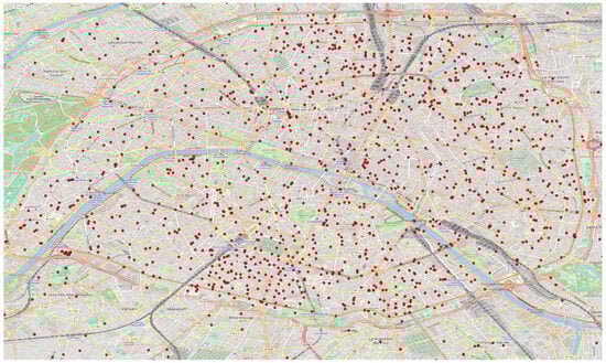 Data for our study were obtained from the Agence Nationale des Fréquences [23], a public administrative body in France tasked with planning, managing, and monitoring the use of public radio frequency spectrum, including private usage, in accordance with Article L. 41 of the Postal and Electronic Communications Code. Our dataset consists of electric field strength measurements collected throughout Paris between 2022 and the first half of 2024 (Figure 1) using portable IoT sensing devices. These measurements were carried out within the framework of Article L.34-9-1 of the French Postal and Electronic Communications Code. The dataset includes frequency ranges from 100 kHz to 6 GHz, covering a variety of sources such as mobile telecommunication systems at different frequencies, FM and radio broadcasting, television (TV), professional mobile radio networks (PMR), HF services (short-wave, medium-wave, and long-wave), radar, Wi-Fi, and cordless phones (DECT). The electric field strength (V/m) was recorded as a spatial average over a six-minute interval. Measurements were taken at three different heights that corresponded to the average human body: , , and , ensuring a complete representation of exposure levels.