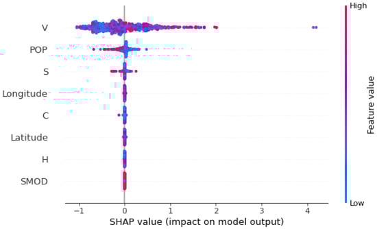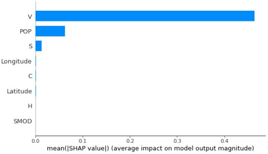 Figure 13 and Figure 14 display the mean absolute SHAP value for each feature, indicating the average impact on the model’s output magnitude. The features are ranked in descending order of importance. The feature representing the total volume of buildings in the area surrounding each antenna (V) has the highest mean SHAP value, suggesting it has the most significant impact on the model’s predictions. The population density feature (POP) is the second most important, but its impact is considerably lower than V. The total surface area of the buildings in the area (S) has a moderate impact on the model. The remaining features, including longitude, C, latitude, H, and SMOD, have minimal impact on the model’s output, as indicated by their low mean SHAP values.