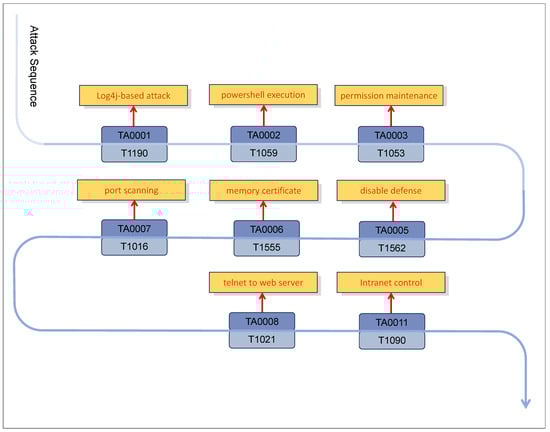 However, these studies on attack prediction still have several limitations. Methods based on attack graphs [6,7] rely on modeling specific scenarios, and they become ineffective when the attack scenarios change. The study [9] predicts the potential timing of future attacks based on the occurrence time data of DDoS attacks; however, in real-world cyberattacks, the attack behavior often lacks a fixed temporal pattern, making this approach challenging to adapt to complex attack scenarios. Although [10] uses a Hidden Markov Model to predict multi-step attack state sequences, the prediction process is not based on a universal, standardized framework to model the attacker’s behavior, which limits the further utilization of the prediction results.