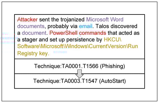 - Husari, G.; Al-Shaer, E.; Ahmed, M.; Chu, B.; Niu, X. Ttpdrill: Automatic and accurate extraction of threat actions from unstructured text of cti sources. In Proceedings of the 33rd Annual Computer Security Applications Conference, Orlando, FL, USA, 4–8 December 2017; pp. 103–115. [Google Scholar]