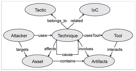 The COASE is an ontology developed in this study to extract effective attack technique utilization sequences from threat reports, enabling the representation of various entities and relationships in threat reports using formally described concepts [32]. Although [24,33] attempted to create cybersecurity ontologies linking ATT&CK knowledge, they failed to capture the essential relationships between TTPs and the interactions of different threat entities. The COASE proposed in this study comprises seven top-level classes: tactic, technique, IoC, attacker, asset, and artifact. Figure 4 illustrates the relationships between different top-level classes in the ontology developed in this study.