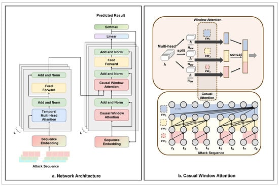 In the decoder, we introduced a modification to the traditional attention mechanism. Different attack techniques within the attack sequence exhibit causality. We replaced the traditional decoder attention with causal window attention. Figure 5b shows the architecture of causal window attention with h attention heads and scale windows. In this example, we set and , dividing h attention heads into window groups and performing self-attention calculation across windows of different scales to capture multi-scale information within the attack sequence.