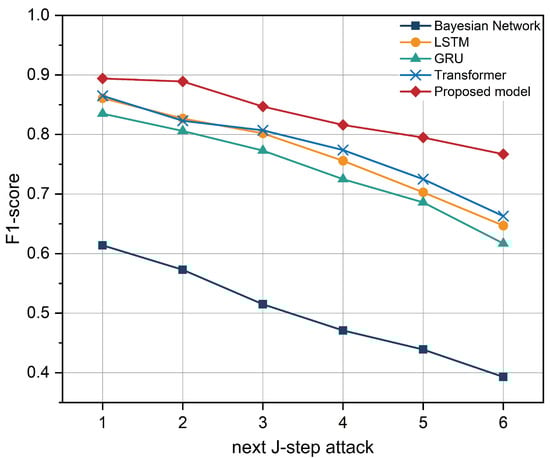 In order to fully evaluate the performance of the models in a multi-step prediction task, we designed an experiment aimed at testing the performance of each model with different numbers of prediction steps. Figure 6 shows the trend in the F1-score of each model with the prediction step J (one to six) in the multi-step attack prediction task. As the prediction step length increases, the performance of all models shows different degrees of degradation, which indicates that the multi-step prediction task places higher demands on the model’s ability to capture long-range dependencies and contextual information. In contrast, DeepOP outperforms the other models, with the most minor performance degradation at all prediction steps.