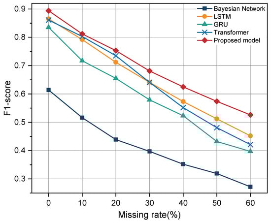 Figure 7 shows the results of our experiments. The experiments use the F1-score to measure the model’s predictive ability in the presence of incomplete input data. The results show that the F1-score of all models decreases as the detection failure rate increases. Still, DeepOP always maintains the best performance, with its F1-score decreasing from 0.894 (0% detection failure rate) to 0.526 (60% detection failure rate), significantly smaller than other models. In contrast, the F1-score of the original Transformer and LSTM drops to 0.421 and 0.452, respectively. At the same time, GRU and Bayesian networks perform even worse, with their F1-scores dropping to 0.397 and 0.272, respectively, which suggests that DeepOP exhibits greater robustness in dealing with missing inputs, especially in the extreme case of a high detection failure rate (50–60%), where the F1-score drops from 0.894 (0% detection failure rate) to 0.526 (60% detection failure rate). In (50–60%) extreme conditions, it still significantly outperforms other methods. This result further validates the effectiveness of the causal window attention mechanism in modeling multi-step attack sequences.
