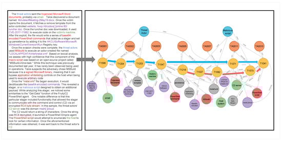 Notably, attack description statements often contain numerous IoCs (Indicators of Compromise) related to current cybersecurity events, such as registry keys, IP addresses, and email addresses. We designed regular expression patterns, as shown in Table 2, to efficiently extract IoC entity types. Additionally, we compared existing natural language processing techniques applied to entity–relationship extraction [23,25] and ultimately chose the CTI entity–relationship extraction tool Extractor [23], based on Semantic Role Labeling (SRL), to complete the entity–relationship extraction tasks in threat reports. The Extractor tool demonstrated high precision and strong relevance in parsing specific entities and relationships in the cybersecurity domain, better meeting the study’s requirements for data accuracy and contextual consistency.