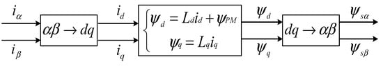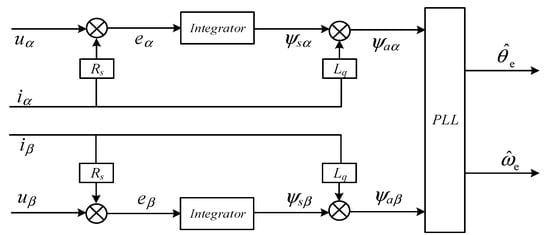 The key to the accurate control of PMaSynRM is to obtain the rotor position and running speed information in real time. However, traditional methods that rely on mechanical position sensors can no longer support the efficient improvement of motor performance under certain operating conditions. Compared with traditional control methods, “plug and play” sensorless control is more popular [1]. At present, sensorless control methods are mainly divided into salient pole tracking based methods and fundamental frequency model based methods. The fundamental frequency model methods are mainly divided into back electromotive force (EMF) method and flux linkage method. The back EMF method is widely used to estimate the rotor position by observing the back EMF [2]. Since PMaSynRM has a large salient pole ratio, the back EMF method needs to re-establish the model to realize the transformation from the salient pole motor to the equivalent hidden pole motor, and the process is relatively complicated. Compared with the back EMF method, the flux linkage method has received more attention because of it does not depend on the motor speed [3,4].