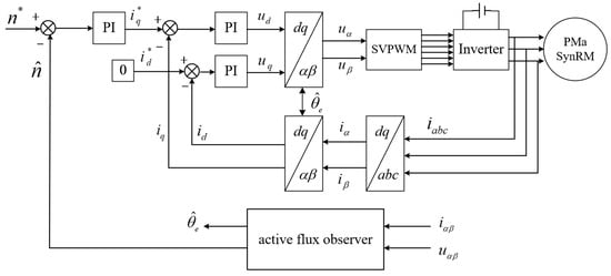 The block diagram of sensorless control of PMaSynRM based on active flux observation. is the reference speed; and are the d- and q-axis reference current respectively.