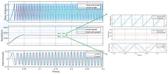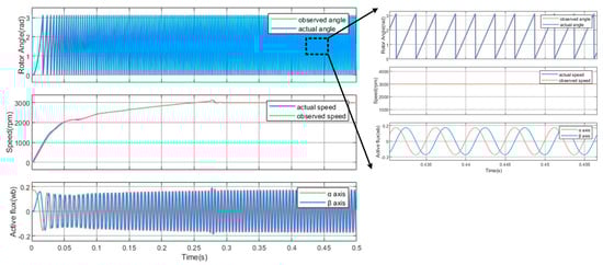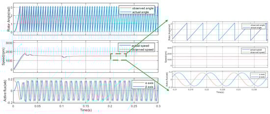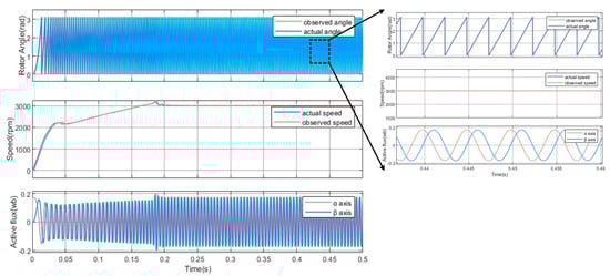 First, the sensorless control effect of the closed-loop active flux observer of the PMaSynRM at the rated speed was verified, as shown in Figure 9.