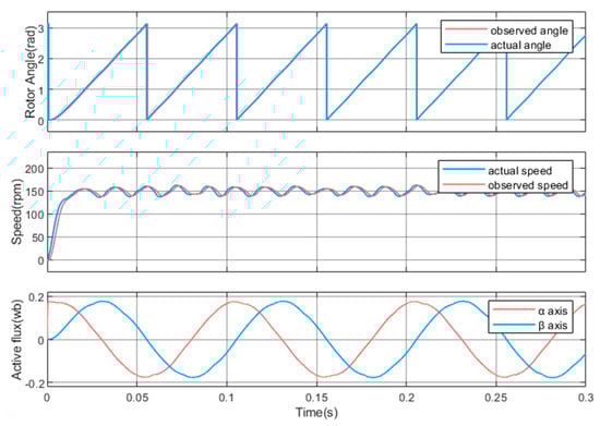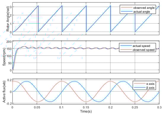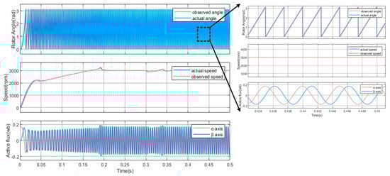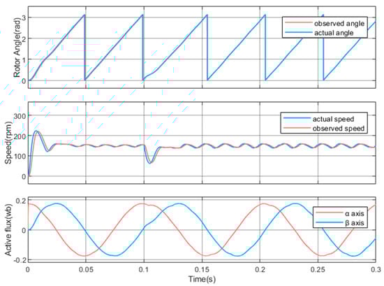 As shown in Figure 11, the load torque 15 N·m is abruptly increased when t = 0.1 s at rated speed. Figure 11 (above) shows the waveforms of the actual angle and observed angle before and after loading. Although the angle error increases at the loading moment, it can quickly return to a stable state, and the observed angle can then quickly and accurately track the actual angle. Figure 11 (middle) shows the speed waveform between the observed speed and the actual speed of the system under the condition of sudden load. When the motor suddenly increases from no-load to rated load, the speed obviously decreases and becomes stable after a short oscillation, and the steady-state speed error is kept within 6 rpm.