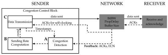 The BDP defines the amount of in-flight data that can traverse the network without requiring buffering. An end-to-end TCP CCA operates on the sender side, and it adjusts the sending rate to prevent the network congestion based on inferred conditions, as shown in Figure 1. In TCP, each end-point in a pair operates as a sender and a receiver at the same time. However, each independently manages its outgoing flow, applying congestion control without visibility into the other’s behavior.