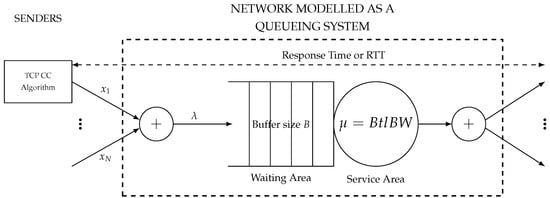Following Stidham’s work [41,42], TCP/IP networks can be modeled as a queueing system [44]. As shown in Figure 2, the system comprises the following:
