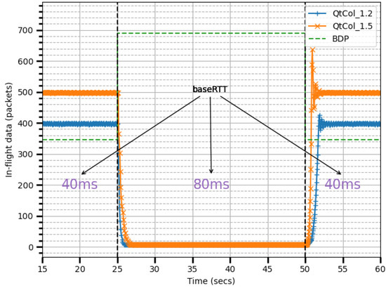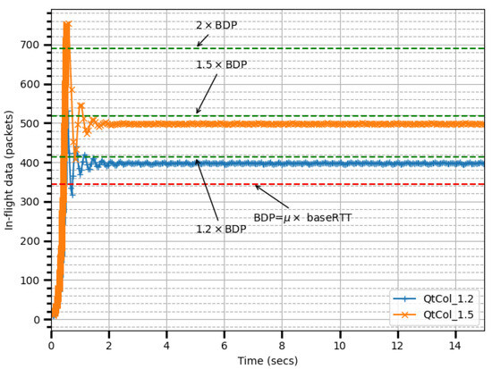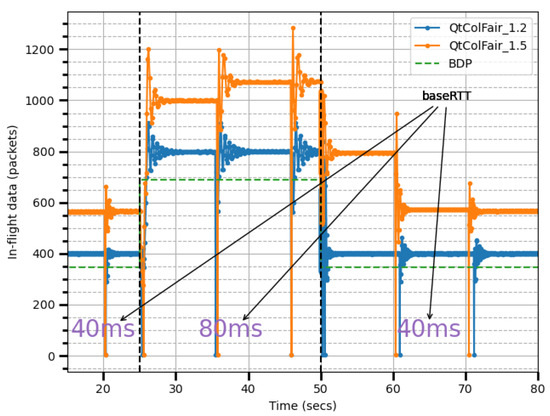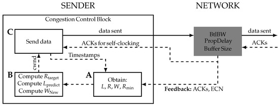 To align with this principle, an optimal congestion control algorithm must adjust the sending rate so that the average data-in-flight remain close to one BDP, ensuring the queue remains nearly empty. TCP BBR, for example, was heavily influenced by Kleinrock’s principle and limits data-in-flight to 2 × BDP to maintain at least one BDP in flight [24,40]. This approach maximizes throughput and minimizes delay by probing the maximum available bandwidth and probing for minRTT.