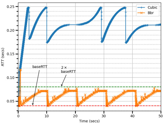 TCP BBR [24], as a prominent Delay-Based algorithm, addresses issues inherent in Loss-Based algorithms, such as bufferbloat and high latency. By limiting in-flight data to approximately 2 × BDP, TCP BBR balances throughput and latency, inspired by Kleinrock’s optimality principle [17]. Studies, such as in [24], show that TCP BBR often outperforms TCP CUBIC in terms of both throughput and latency.