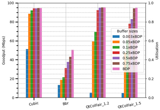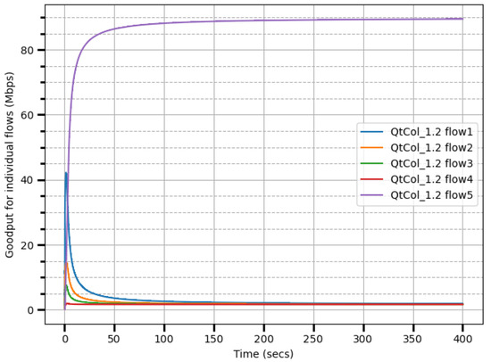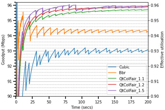- Goodput: The rate of useful data delivery, excluding retransmissions [19]. It is a reliable indicator of effective utilization. It reflects the network’s productive performance.