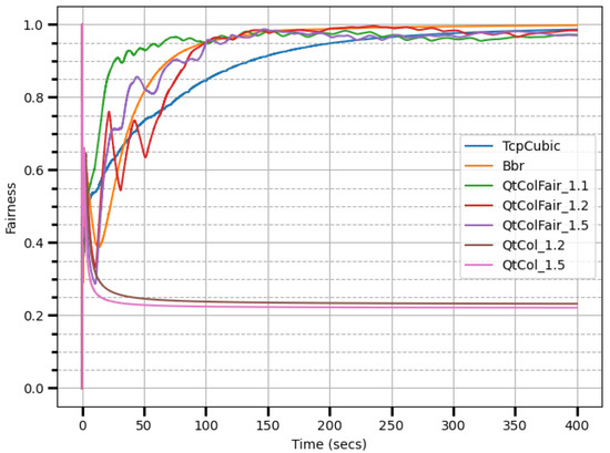where is the throughput of flow i, and N is the total number of flows. A value of indicates perfect fairness, while signifies the poorest fairness. In practice, a fairness index of 0.8 is acceptable [49].